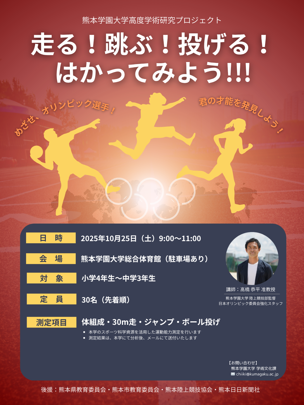 熊本学園大学では、熊本県内の小学4年生から中学3年生のみなさんを対象に「運動能力測定会」を開催します!